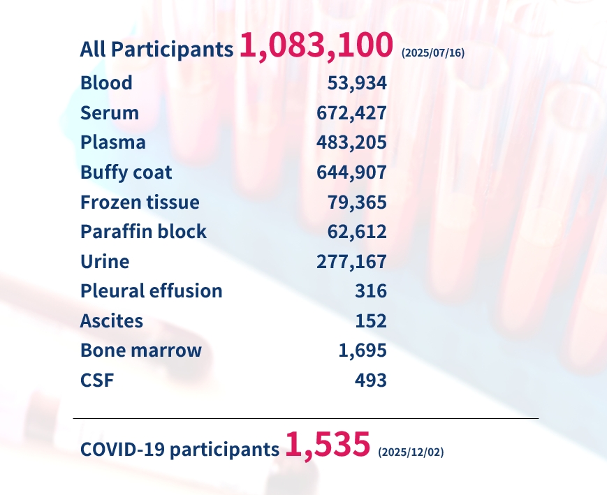For the health of you and the next generation, welcome to join the human biodata database. As long as you are between 30 and 70 years old, people of nationality, no foreign descent, and no cancer can participate. If you have If you are willing to participate, you can contact our partner organization, sign a consent form, conduct a physical examination, collect samples (blood and urine, etc.), and fill out a questionnaire to contribute to biomedical research and promote healthy development.